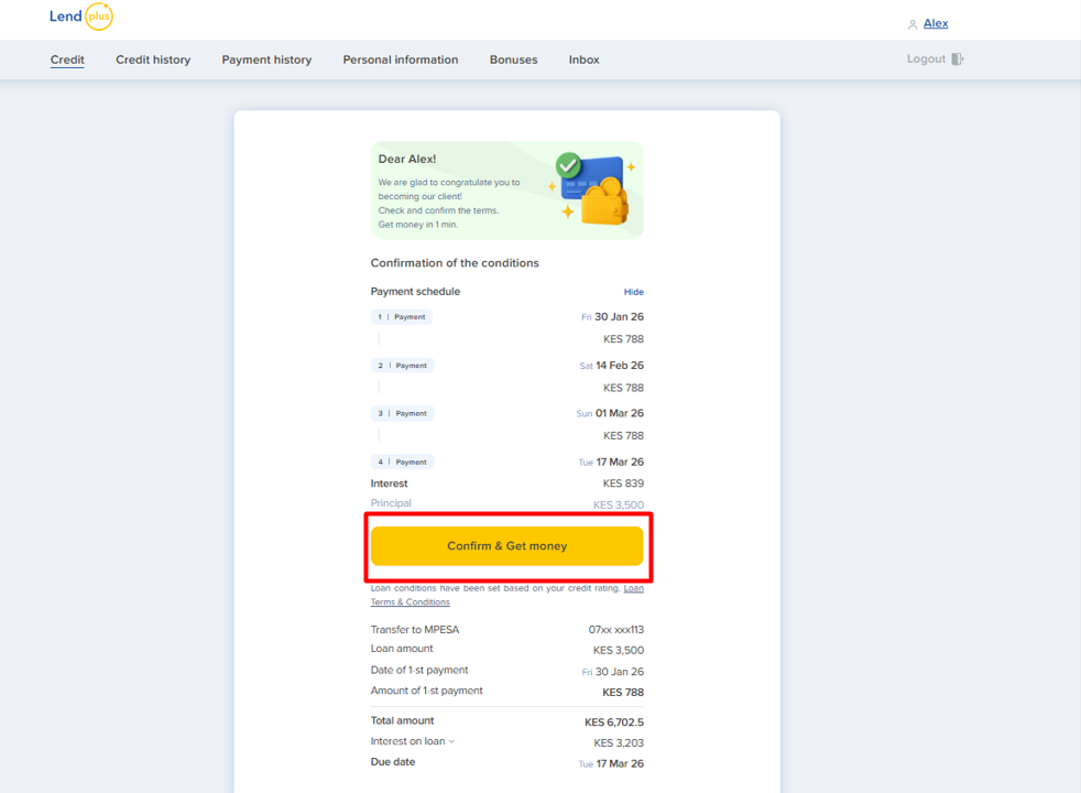 In the Application Confirmation page, adjust the loan amount and loan term bars in the LendPlus app or Website to select the amount you want to borrow and the repayment period, respectively. There are no complicated forms—simply choose your desired loan amount.